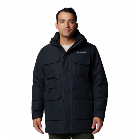 Męska kurtka typu parka marki Columbia w czarnej kolorystyce. Jej wierzchnia warstwa wykonana jest z poliestru, od wewnątrz podszyta jest bawełną. Kurtka posiada odpinany kaptur, oraz regulowane rzepami rękawy i talię. Posiada różne obszerne kieszenie zewnętrzne, oraz wewnętrzną na drobiazgi.