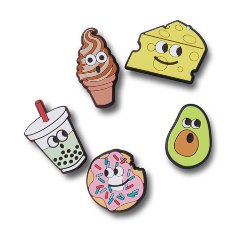 Zestaw pięciu przypinek do klapek i sandałów marki Crocs.