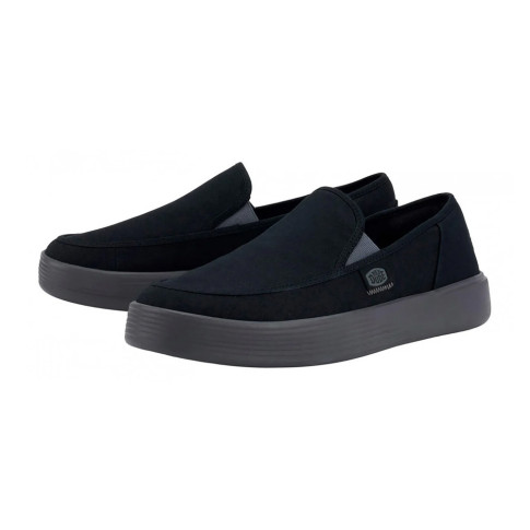 Męskie, wsuwane tenisówki marki Heydude. Cholewka tego modelu wykonana jest z materiału typu canvas, w prezentowanym wydaniu w czarnym kolorze. Masywna, gumowa podeszwa w szarym kolorze sprawia, że buty są niezwykle wygodne.
