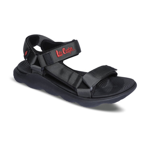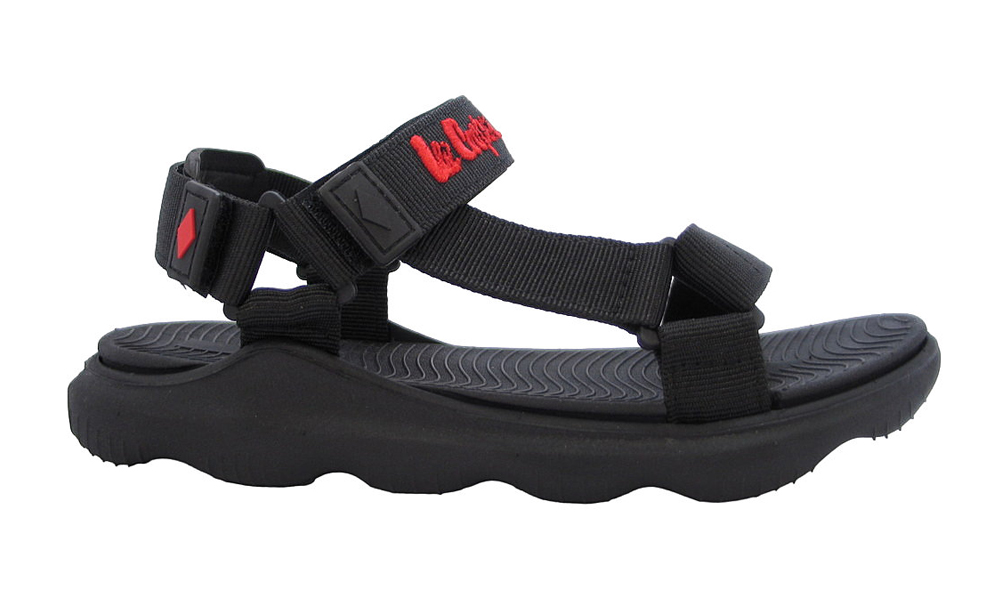 Męskie sandały marki Lee Cooper to połączenie wygody i świetnego wyglądu. Sadnały osadzone zostały na podwyższonej, piankowej podeszwie, któa pokryta jest ciekawym bieżnikiem. Górne paski wykonane z materiału zapewniają dobre dopasowanie do stopy, pod nimi znajduje się materiałowa wyściółka. Czarna kolorystyka świetnie wygląda.