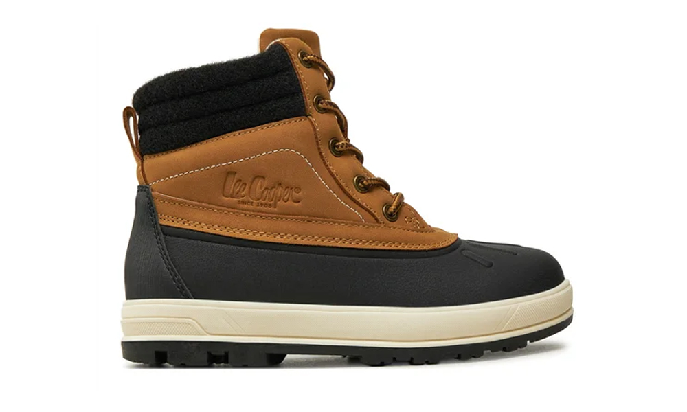 Młodzieżowe śniegowce marki Lee Cooper przeznaczone dla najmłodszych użytkowników. Zaczynając od spodu, znajdziemy tam gumową podeszwę z agresywnym bieżnikiem, który wgryza się w śnieg. Zachodzi ona na dolną część cholewki, stanowiąc dodatkową ochronę przed śniegiem czy wodą oraz zapewniając izolację cieplną. Góra cholewki to miękki, ocieplony od środka materiał, który nie krępuje ruchów. Czarno miodowa kolorystyka świetnie wygląda.