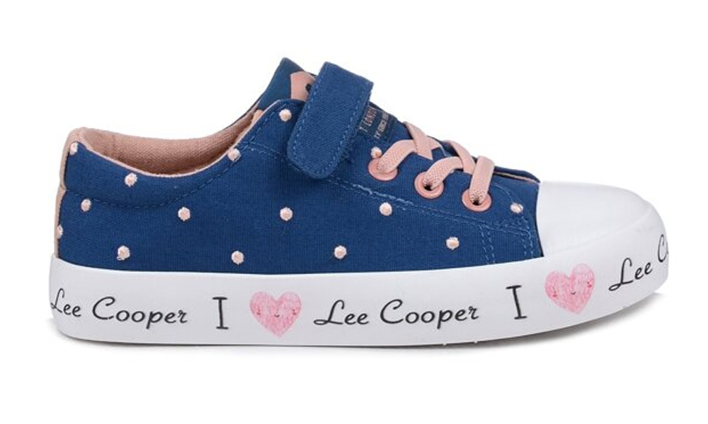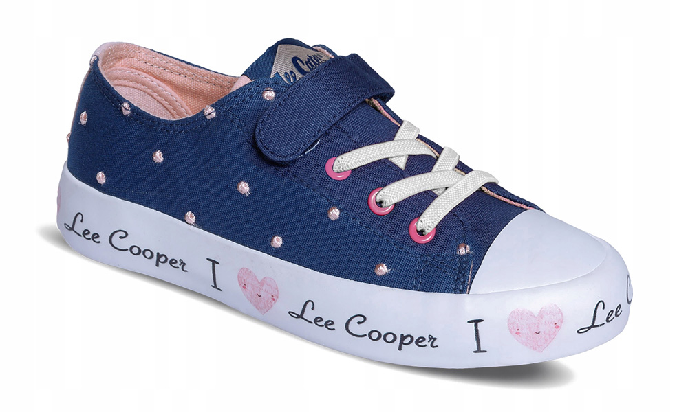 Dziecięce, klasyczne trampki marki Lee Cooper w białej kolorystyce. Cholewka tego modelu zapinana jest na jeden rzep, wykonana jest ona z lekkiego i przewiewnego materiału ozdobionego różowymi akcentami. Gumowa podeszwa zachodząca na czubek buta to gwarancja wygody.