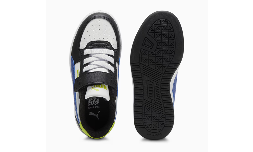 Dziecięce tenisówki Puma Caven idealnie wpasowują się w panujące trendy. Prosta cholewka wykonana ze skóry syntetycznym w czarno białym kolorze, osadzona została na również czarnej, masywnej, gumowej podeszwie. Całość prezentuje się świetnie i pasuje do każdej stylizacji. Buty sznurowane i zapinane na jeden rzep.
