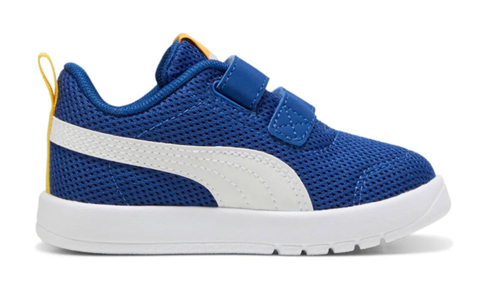 Dziecięce buty marki Puma idealne na ciepłe dni. Cholewka buta o bardzo klasycznym kształcie wykonana jest w całości z lekkiej i przewiewnej siateczki. Na jej boku znajduje się pasek białego koloru, pasujący kolorystycznie do gumowej podeszwy. Buty zapinane są na dwa rzepy, co pomaga dopasować je do stopy.