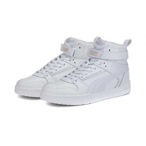 Męskie buty Puma RBD Game garściami czerpią inspiracje z modeli koszykarskich z lat 80 i 90-tych. Wysoka cholewka sięgająca ponad kostkę wykonana jest z wysokiej jakości skóry syntetycznej, w prezentowanym wydaniu w białym kolorze. Osadzona została ona na wysokiej, gumowej podeszwie z gumowym bieżnikiem, Ciekawym dodatkiem jest zapięcie na rzep w górnej części buta.