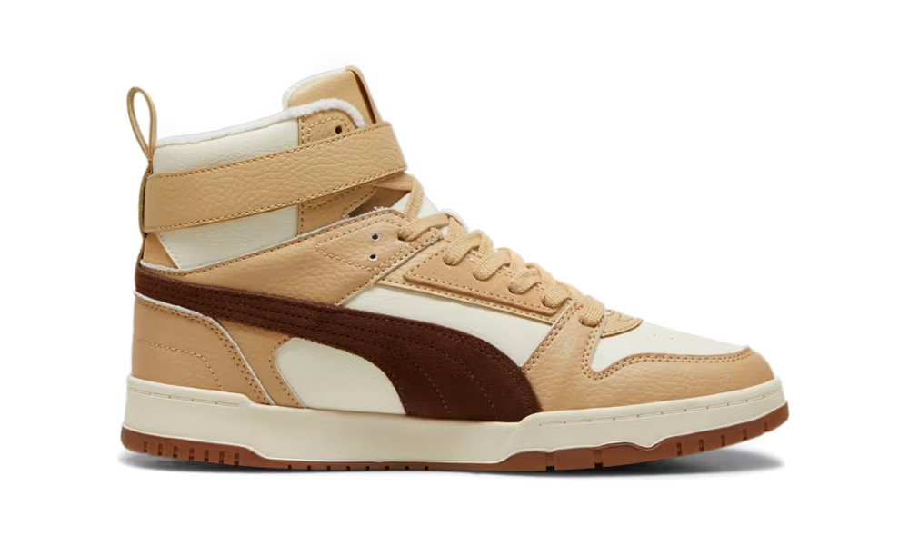 Męskie buty Puma RBD Game garściami czerpią inspiracje z modeli koszykarskich z lat 80 i 90-tych. Wysoka cholewka sięgająca ponad kostkę wykonana jest z wysokiej jakości skóry syntetycznej, w prezentowanym wydaniu w beżowym kolorze. Osadzona została ona na wysokiej, gumowej, białej podeszwie z gumowym bieżnikiem, Ciekawym dodatkiem jest zapięcie na rzep w górnej części buta.