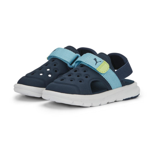 Lekkie, dziecięce sandałki Puma Evolve sprawdzą się idealnie do zabawy na plaży czy na basenie. Cholewka tego modelu wykonana jest z lekkiego, szybkoschnącego materiału. Ma ona zabudowany przód, co zapewnia dodatkową ochronę palcy. Z tyłu znajdują się dwa regulowane paski.