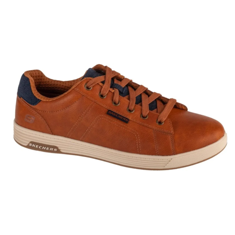 Casualowe, niskie tenisówki marki Skechers będą idealnym wyborem na cieplejsze dni, Smukła cholewka tego modelu wykonana została z wysokiej jakości skóry syntetycznej, w prezentowanym wydaniu w brązowym kolorze. Osadzona została na gumowej podeszwie, która jest gwarancją wygody użytkowania.