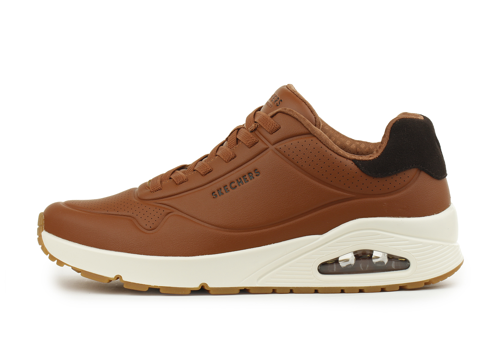 Skechers Uno – Tailored Air to stylowe męskie sneakersy do kostki w eleganckim brązowym odcieniu. Model łączy miejską estetykę ze skuteczną amortyzacją — podeszwa Skech‑Air® z widoczną poduszką powietrzną zapewnia lekki, sprężysty krok i doskonałą ochronę przed wstrząsami. Wykonane z wysokiej jakości materiałów, oferują trwałość i wygodę na co dzień.